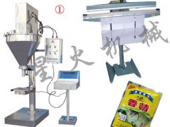 香料包装机 ① (粉剂包装机)具有自动定量、自动充填、自动调整计量误差等功能,人工套袋,光电开关控制,袋口干净,易封口,采用步进电机及电子称量技术,包装精度高,适用于香料、葡萄糖、奶粉、面粉、精细白沙糖、味精、调味品等粉末料状包装。