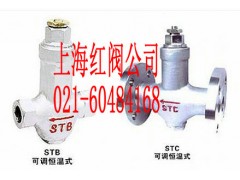 上海红阀ST系列可调恒温式蒸汽疏水阀属热静力型中的一种新产品。阀内感温元件中装有感温剂、饱和剂、稳定剂和填充剂组成的感温混和物.该阀根据阀腔内温度的变化造成波纹管内感温液体的汽化或冷凝,波纹管的内压产生变化而驱使波纹管带动阀芯移位启闭阀座孔,达到阻气排水。