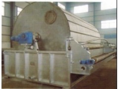 折带式真空转鼓过滤机工作原理与刮刀式基本相同,不同仅是滤渣卸除的方式为折带卸渣,因此折带式转鼓真空过滤机的滤布是曲折的绕装于转鼓和各滚轴间。对细黏物料的过滤效果较好。而刮刀式过滤细物料时,存在着卸料困难、透气性差、滤布容易堵塞、滤饼水分高、生产能力低等缺点。由于折带式过滤机改变了卸料方式,加强了对滤布的清洗,便基本上克服了这些缺点。当滤饼经过真空区以后,滤布就由一套辊子引出筒外进行卸料和清洗,清洗好的滤布再回到筒体重新工作。折带式真空过滤机是让滤布绕过卸料辊,通过变化曲率使滤饼自由落下,也可以利用刮板等机构帮助卸料。这样卸料提高了过滤能力,而且不用鼓风,使滤饼不致因回水增加水分。折带式过滤机将滤布引到筒体以外,有足够的时间采用有效的方式清洗滤布。一般用压力水冲滤布的两面,还可以根据需要用刷子和打布器等装置进行更测底的清洗,以保证滤布的透气性。折带式真空过滤机适用于细、黏物料的脱水,广泛用来过滤浮洗后的有色金属精矿和煤的浮洗产品及处理污水。