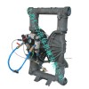 RG粉末隔膜泵工作原理:在隔膜泵的两个对称工作腔中,各装有一块有弹性的隔膜,连杆将两块隔膜结成一体,在气源进口出安装两位五通电磁阀,压缩空气从泵的进气接头进入中间体后,推动两个工作腔内的隔膜,驱动连杆联结的隔膜同步运动。与此同时,另一工作腔中的气体则从其隔膜的背面排出泵外。当活塞达到行程终点,配气阀机构则自动的将压缩空气引入另一工作腔,推动隔膜泵朝反向运动,这样就形成了两个隔膜的同步往复运动。每个工作腔中又设置两个单向球阀,隔膜的往复运动,造成工作腔内容积的改变,迫使两个单向球阀交替的开启和关闭,从而使粉末连续的吸入和排出。
