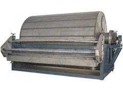 带式转鼓真空过滤机工作原理与刮刀式其本相同,不同仅是滤渣卸除的方式为折带卸渣,因此折带式转鼓真空过滤机的滤布是曲折的绕装于转鼓和各滚轴间。对细黏物料的过滤效果较好。而刮刀式过滤机过滤细黏物料时,存在着卸料困难、透气性差、滤布易堵塞、滤饼水分高、生产能力低等缺点。由于折带式过滤机改变了卸料方式、加强了对滤布的清洗,便基本上克服了这些缺点。当滤饼经过真空区以后,滤布就由一套辊子引出筒外进行卸料和清洗,清洗好的滤布再回到筒体重新工作。 折带式真空过滤机不采用鼓风机卸料,而是让滤布绕过卸料辊,通过变化曲率使滤饼自动落下,也可以利用刮板等机构帮助卸料。这样卸料不仅提高了过滤能力,而且不用鼓风,使滤饼不致因回水而增加水分。折带式过滤机将滤布引到筒体以外,有足够的时间采用有效的方法清洗滤布。一般用压力水冲滤布的两面,还可根据需要用剧子和打布器等装置进行更彻底的清洗,以保证滤布的透气性。 折带式真空过滤机适用于细、黏物料的脱水,广泛用来过滤浮洗后的有色金属精矿和煤的浮洗产品及处理污水。