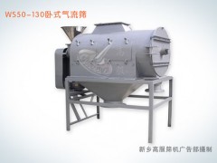 WS系列气流筛分机摈弃重力势能作业原理,采用空气作载体,动能作功的作业原理。通过负压气流将物料与空气混合后,进入筛机风轮中间,通过风轮叶片施加足够的离心力,向桶型筛网喷射过网,经过蜗壳收集。超径物料不能过网,由自动排渣口排出,从而达到快速筛分之目的。
