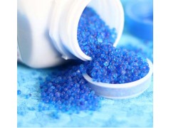 性状:蓝色硅胶,外观为蓝色或浅蓝色玻璃状颗粒,根据颗粒形状可分为球形和块状两种,具有吸湿后自身颜色由蓝色变红色的特性。本品为球形或不规则形状的颗粒,其主要成分为二氧化硅,颜色随湿度不同而变化。