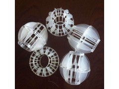 球形由聚丙烯(PP)塑料制成,两个半球合成一个球形。每个半球根据设计要求有8-12个半扇形叶片,两个半球的扇形叶片相互错开。该填料特点是比表面积大,空隙率较高。但由于叶片数目过多,彼此之间存在一定的遮蔽作用,不利于液体的分配与润湿;大部分液体在球形中空柱聚集,阻碍气体的通畅,因而阻力大。