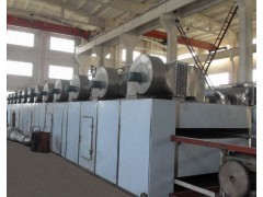 物料由加料器均匀地铺在网带上,网带一般采用12-60目不锈钢丝网,由传动装置拖动在干燥机内移动。干燥机由若干单元组成,每一单元热风独立循环,部分尾气由专门排湿风机排出,废气由调节阀控制,热气由下往上或由上往下穿过铺满物料的网带完成热量与质量传递的进程,带走物料水份。网带缓慢移动,运行速度可根据物料温度自由调节,干燥后的成品连续落入收料器中。上下循环单元根据用户需要可灵活配备,单元数量亦可根据需要选取。