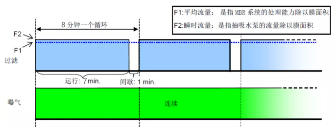1、过滤方式:为了进行MBR的稳定过滤,达到膜表面清洗,要在抽吸和抽吸之间设定停止时间。必须要按照以下间隔进行间歇抽吸运行。
