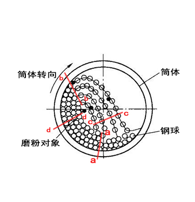 磨粉介质一般为钢球,钢球与筒体之间存在摩擦。当筒体转动时,钢球被带动上升到一定的高度,然后在自身重力的作用下沿一定的轨迹落下。同时,钢球受到两个力,来自筒体切面的力和重力,这两个力形成一对力偶。钢球与相邻钢球之间存在挤压力,每个钢球在力偶的作用下自动旋转,即自转;此外,筒体与最外层钢球之间,以及各层钢球之间也存在不同大小的摩擦力,使每一层钢球围绕筒体的轴线旋转,即公转。
