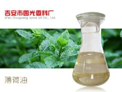 淡黄色或淡草绿色液体。稍遇冷即凝成固体。呈强烈薄荷香气和清凉的微苦味。凝固点5~28℃,酸值小于2。溶于非挥发性油、矿物油和丙二醇,不溶于甘油。