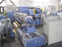 密炼机的团状料经提升机,锥双喂料机,挤出机,切粒,冷却,筛分,终端料仓全部自动化,流水作业。物料密炼后能强制进入单螺杆,螺杆全称分散,无过分摩擦热。分散效果优异,主机电流小,节能环保。此机台用于PVC,低烟无卤电缆料,内外屏蔽电缆料,氯化聚乙烯,功能母粒,色母粒,热收缩料,PP+炭黑低烟无卤系列等塑胶原料的生产,包括主机,锥双强制入料,模面热切等系统将密炼机撹好的原料经锥双挤入造粒机内,后经单螺杆挤出后切成粒子,此机组操作非常简单。