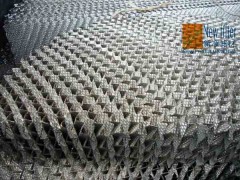 金属压延孔板波纹填料是另一种有代表性的板波纹填料。它与金属孔板波纹填料的主要区别在于板片表面不是冲压孔,而是刺孔,用辗轧方式在板片上辗出很密的孔径为0.4~0.5mm小刺孔。其分离能力类似于网波纹填料,但抗堵能力比网波纹填料强,并且价格便宜,应用较为广泛。 Structured Tower Packing