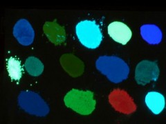 投脑智富荧光粉:变色原理为吸收特定波长之紫外光源,藉由该光源之能量而产生颜色变化(变为紫色、红色、兰色、黄色等),当特定波长的紫外光源不在时,即回复原来的颜色。