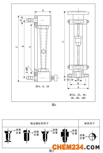 LZB/LZB-( )F 流量计的锥管为光滑内壁管(见图4),通径DN15以上的流量计,浮子通过导杆 上下移动,保持稳定;LZJ/LZJ-( )F流量计锥管 内壁有三条导向凸筋,使浮子保持稳定(见图4)。通径DN10以下的 流量计 采用软管连接,配有 针形流量调节阀;通径DN15以上流量计采用法兰连接。